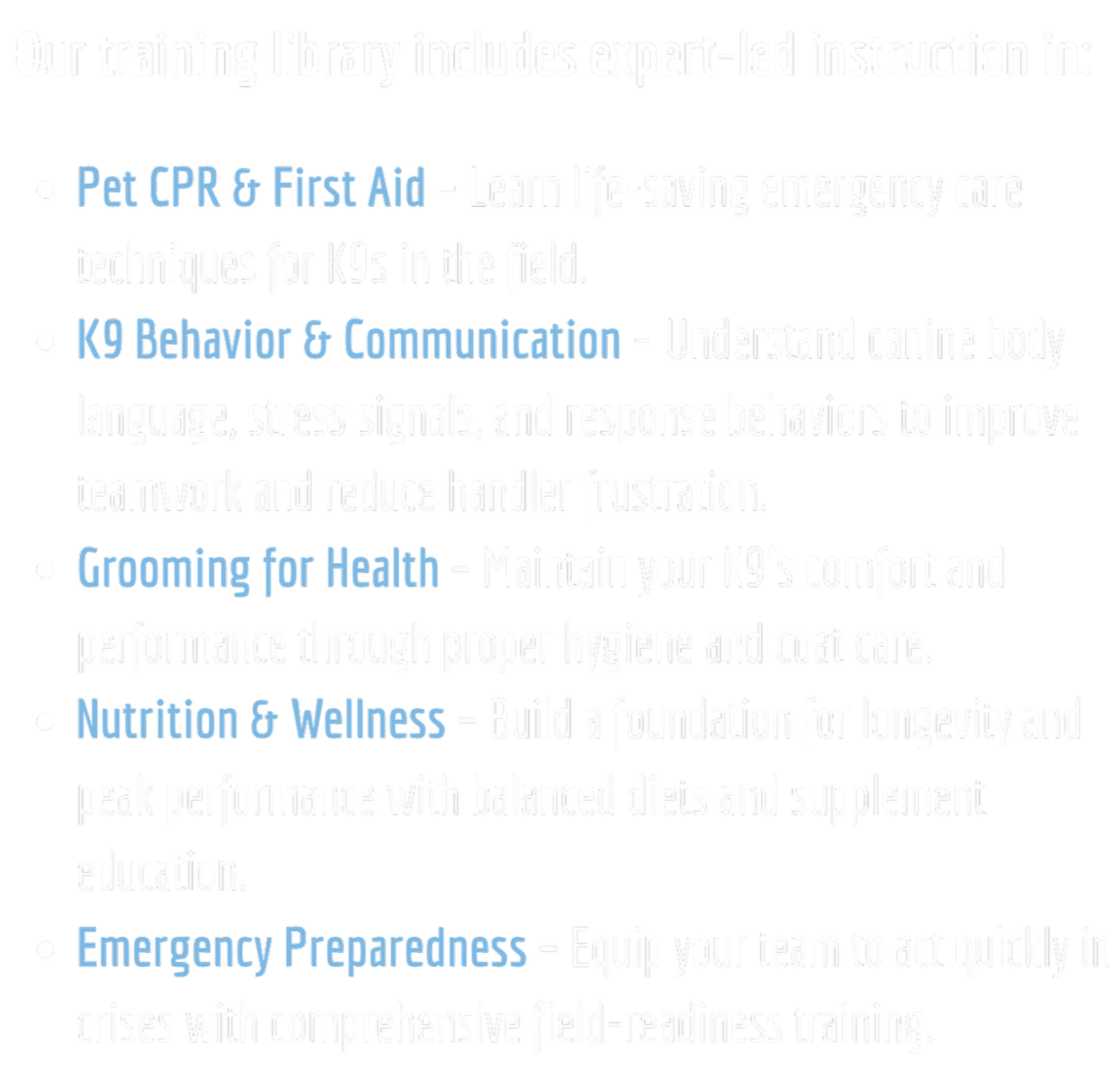 All courses are developed by experienced instructors, including veterinary professionals and active first responders. Many offer certification options to support departmental compliance and continuing education requirements. Because healthy, supported K9s mean stronger teams — and stronger teams save lives.